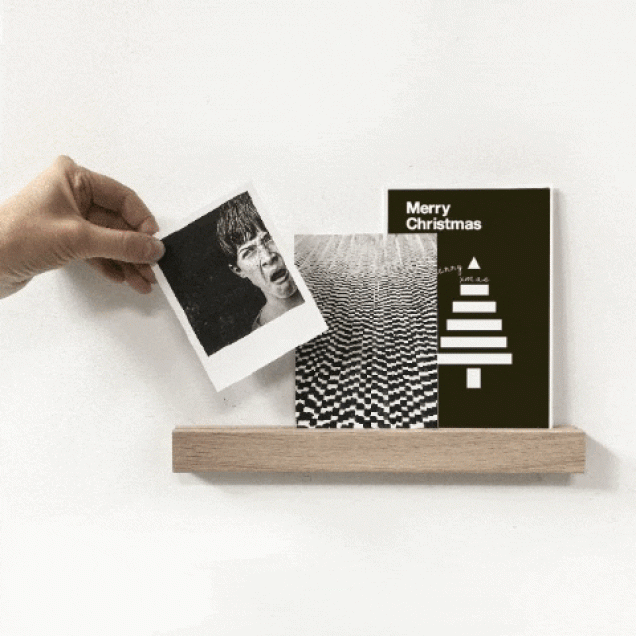 Expune fotografiile și printurile preferate în șanțul acestei polițe de perete din lemn. Fără ciocane și cuie! Montarea acestei polițe nu necesită abilități speciale: pur și simplu fixeaz-o ca un magnet pe o suprafață plană care conține fier, cum ar fi tapetul și stickerele noastre, frigiderul sau un calorifer.