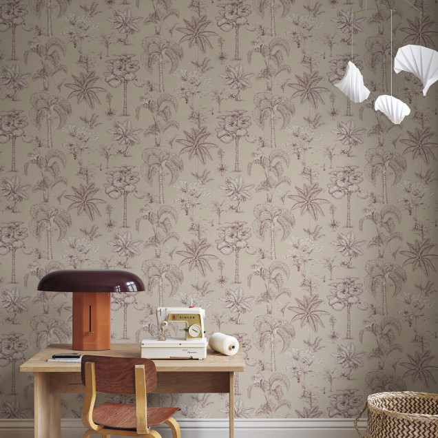 Creează un ambient tropical relaxant cu acest tapet bej. Modelul delicat cu palme aduce un aer exotic și elegant în orice cameră. Ideal pentru living, dormitor sau birou. 5.3mp/rolă.