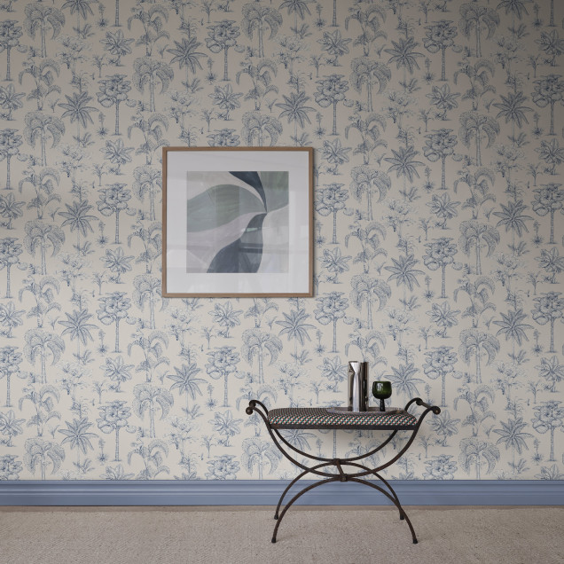 Evocă un sentiment tropical cu acest tapet elegant. Model cu palmieri albaștri pe fundal bej, ideal pentru un decor rafinat și relaxant.