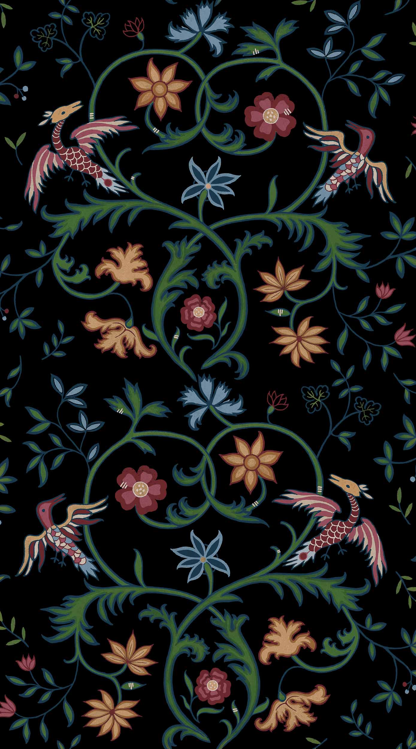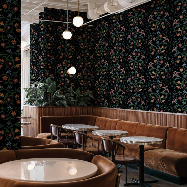 Transformă-ți spațiul cu acest tapet elegant! Design floral complex pe fundal negru. Perfect pentru un interior sofisticat și primitor.