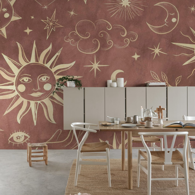 Acest tapet cu design astronomic in tonuri de rosu ofera o atmosfera calda si misterioasa. Perfect pentru un interior boem si relaxant.Materiale disponibile