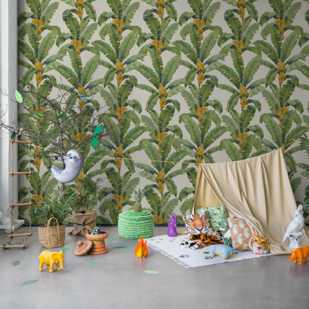 Tapet cu frunze de banane, un design vibrant ce aduce natura în interior. Ideal pentru living sau dormitor. Creează un spațiu relaxant și plin de culoare.Materiale disponibile