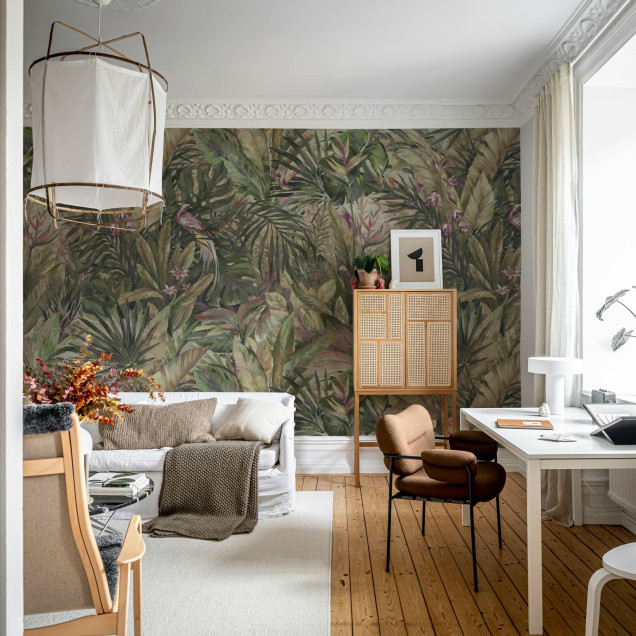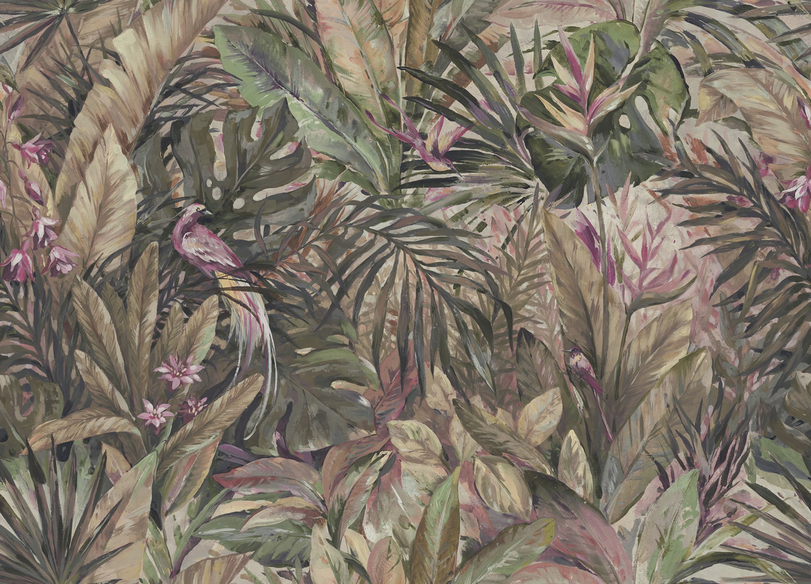 Creează o atmosferă luxuriantă cu acest tapet. Designul vibrant cu frunze tropicale și accente liliac aduce natura în interiorul casei tale.Materiale disponibile