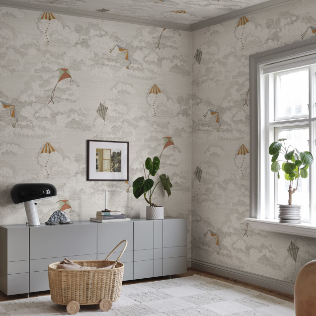 Tapetul cu zmee aduce un plus de veselie și imaginație în camera copilului. Ideal pentru a crea un ambient primitor și plin de culoare.- Colecție: Familjen