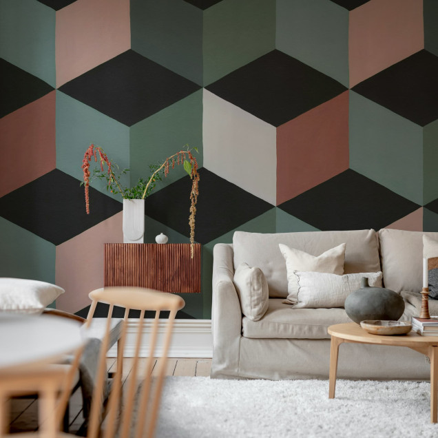 Acest tapet cu romburi colorate adaugă un plus de stil și originalitate oricărui interior. Perfect pentru living, dormitor sau birou. Un design modern și atrăgător!Materiale disponibile