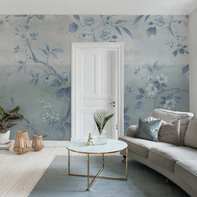 Concrete Flowers, Blue, Rebel Walls Fototapet Floral cu Efect de Beton - Eleganță Albastră