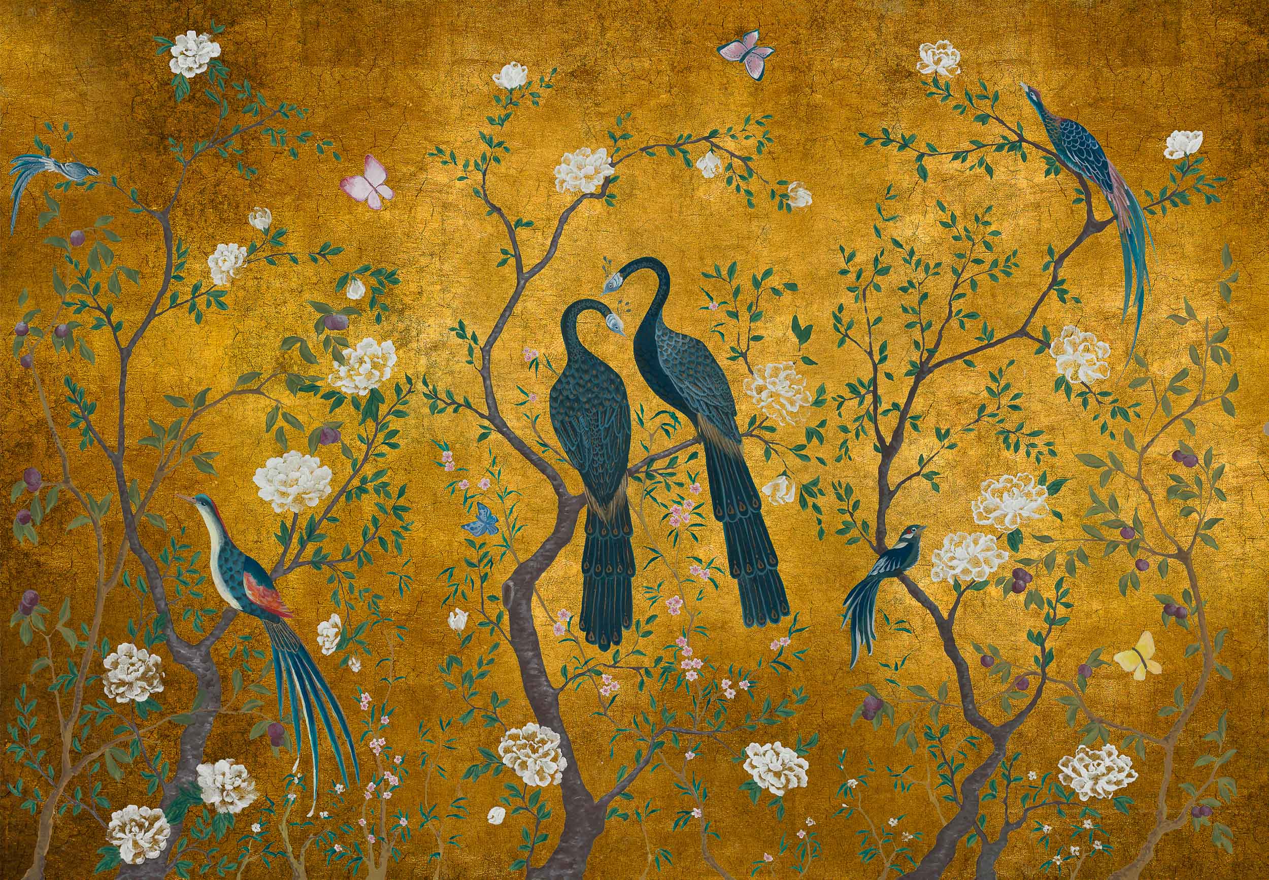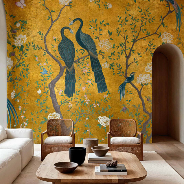 Creează un ambient sofisticat cu acest tapet elegant. Tonuri aurii rafinate se îmbină armonios cu motive florale delicate și păsări stilizate, aducând un plus de lux și naturalețe în orice încăpere. Ideal pentru un living impunător sau un dormitor relaxant.