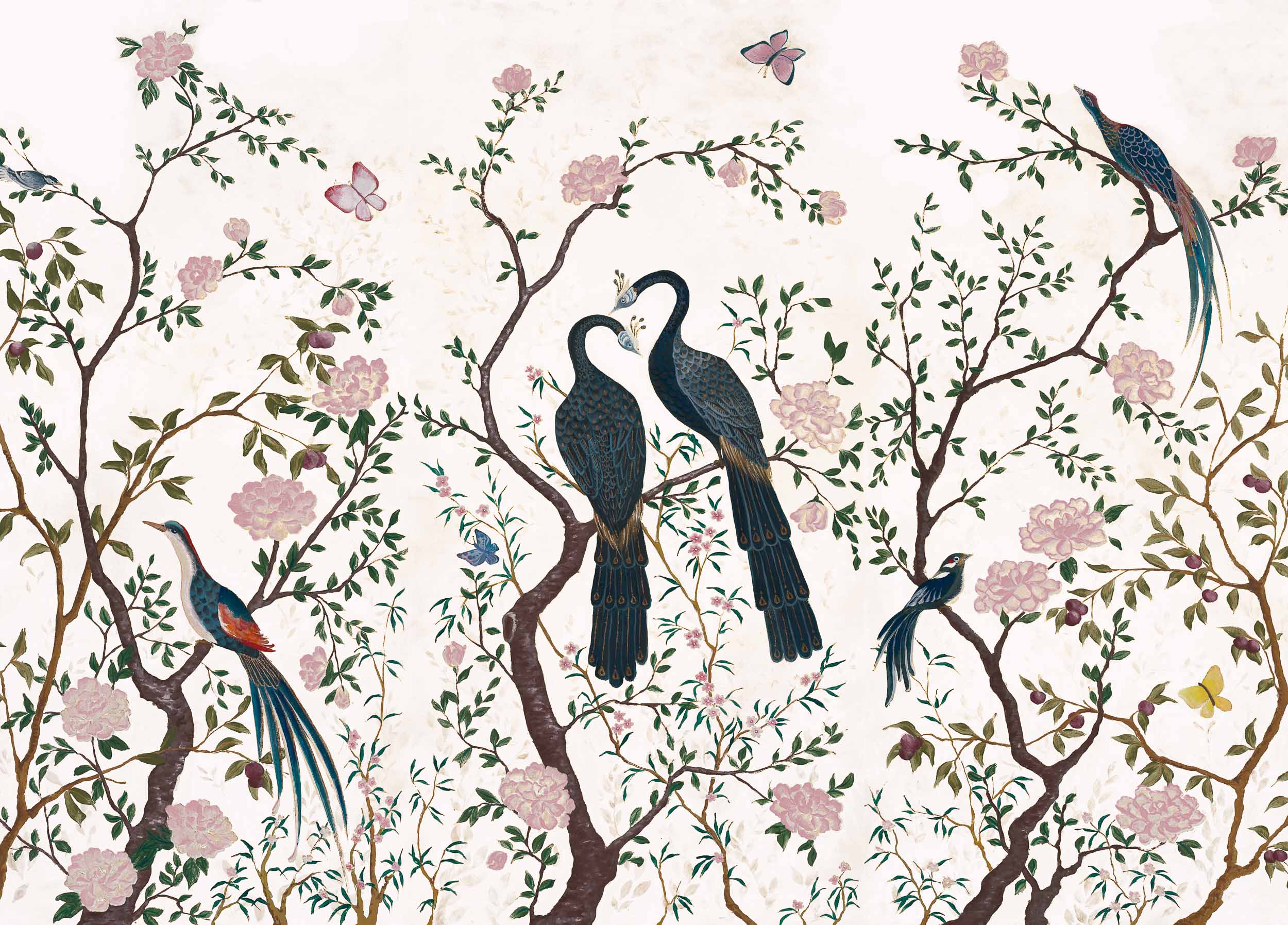 Tapiserie chineză mitică, în care procesiunea regală a doi păuni prinde viață. O compoziție echilibrată de ramuri și bujori grațioși.