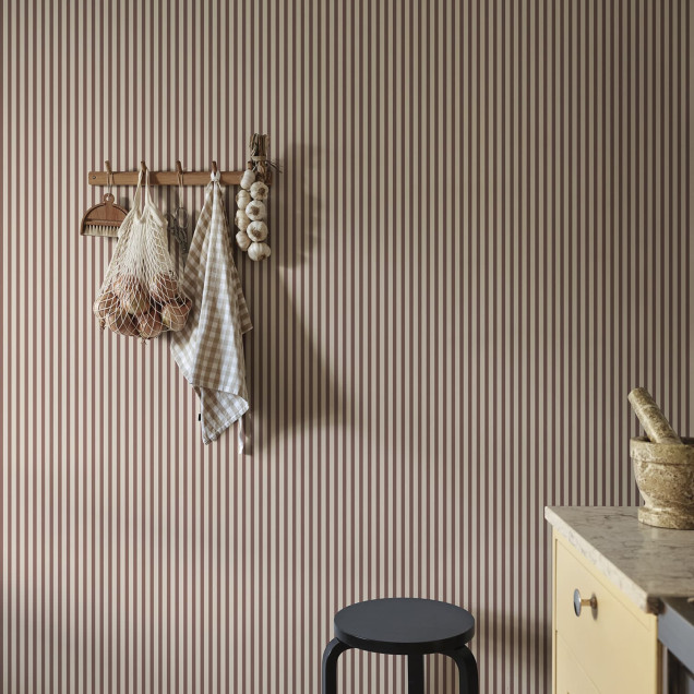 Creează un ambient elegant cu acest tapet cu dungi verticale în tonuri calde de burgundy și bej. Ideal pentru orice cameră, adaugă un plus de stil!- Colecție: Familjen