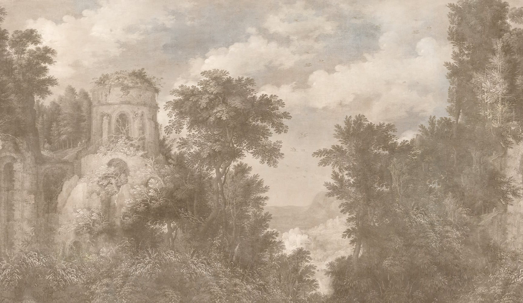 Pictat manual în tonuri patinate de terracotta, mușchi și albastru pal, Eternal Ruins surprinde texturile pietrei și ale vegetației. Îmbină natura cu arhitectura într-o îmbrățișare decadentă.