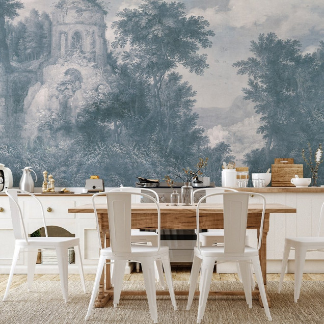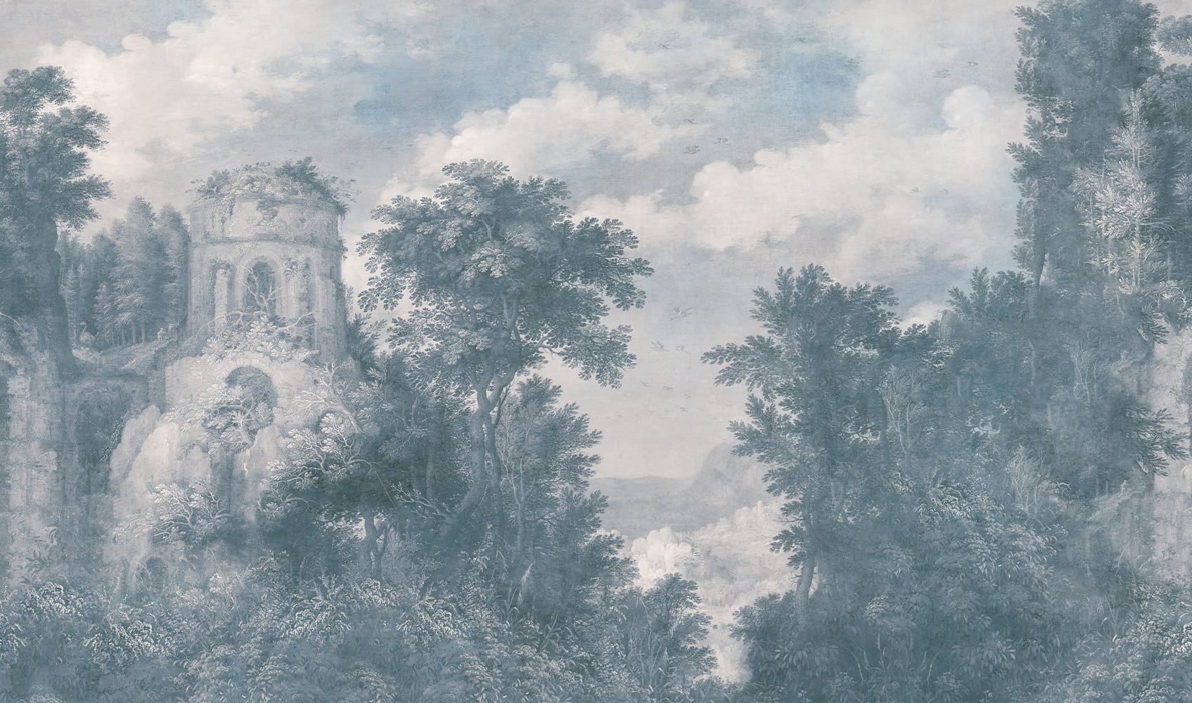 Pictat manual în tonuri patinate de terracotta, mușchi și albastru pal, Eternal Ruins surprinde texturile pietrei și ale vegetației. Îmbină natura cu arhitectura într-o îmbrățișare decadentă.