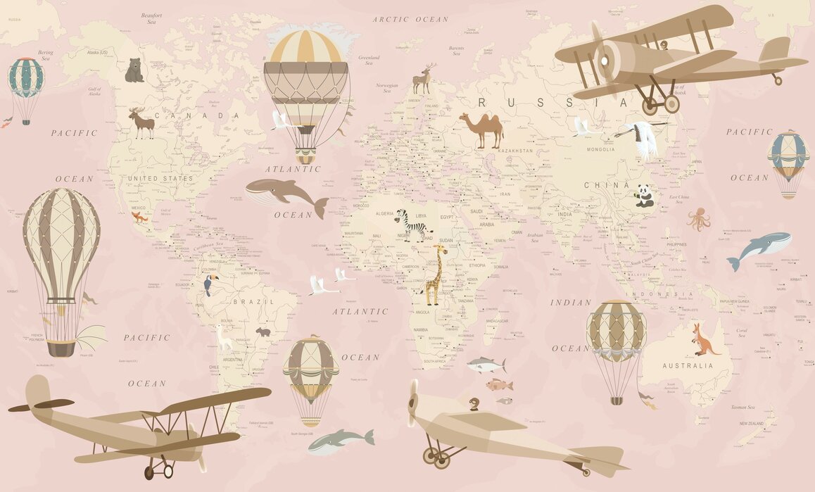 Decorează camera copilului cu un fototapet incitant! Această hartă a lumii în nuanțe delicate de roz stimulează imaginația și transformă spațiul într-o aventură continuă. Ideal pentru exploratorii mici!
