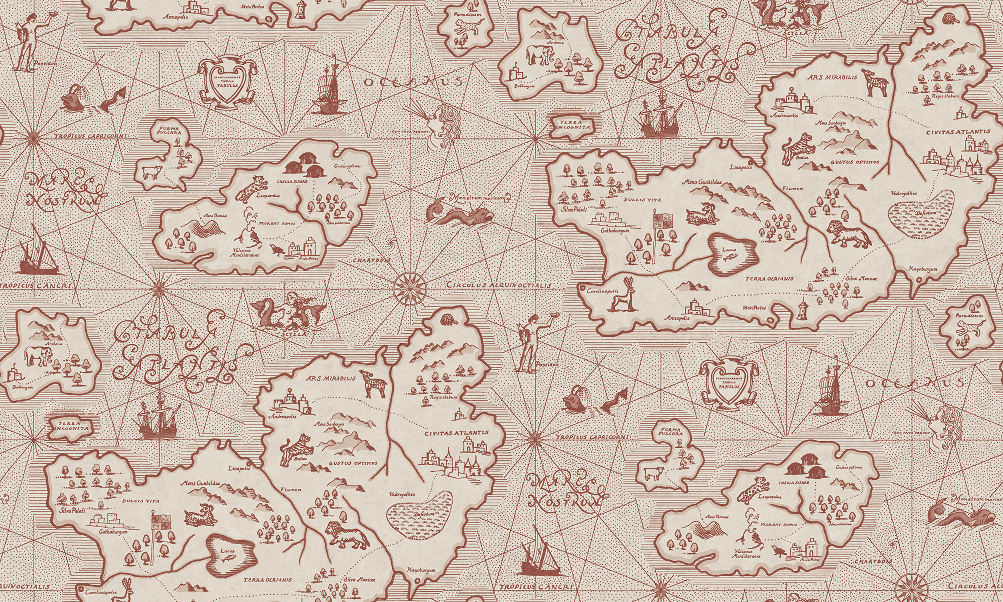 Ferdinand este harta proprie a lui Sandberg în latină, având Atlantida ca model. Pe insulele mici, veți găsi unele dintre animalele din modelul nostru Leonard, iar Poseidon pozează și el în această hartă mitologică cu influențe de pe Coasta de Vest. Culoarea bogată burgundy adaugă profunzime și eleganță clasică.
