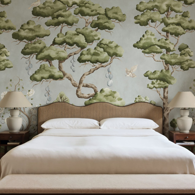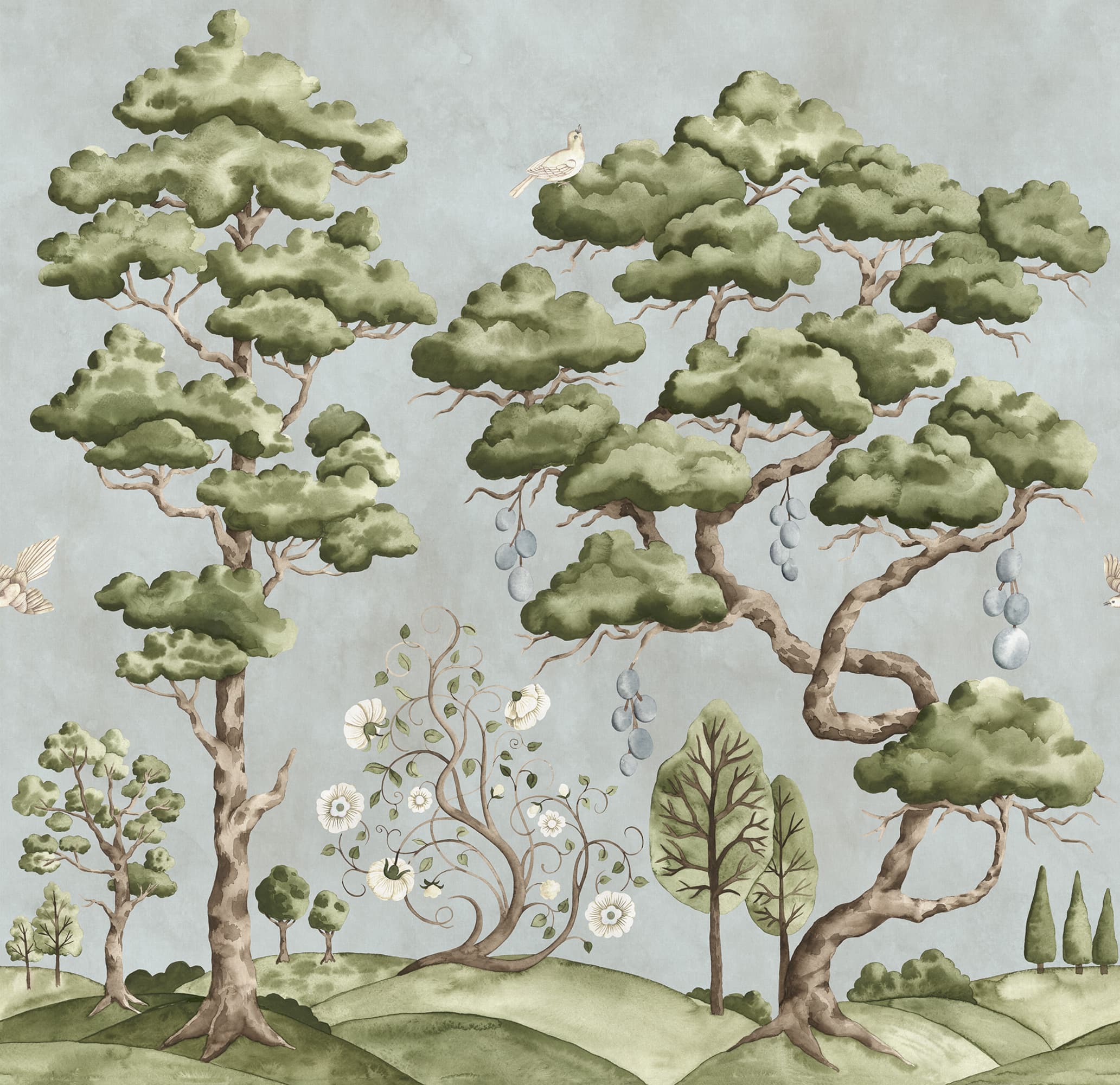 Forest Poem, Light Blue, Rebel Walls Tapet elegant cu arbori și păsări