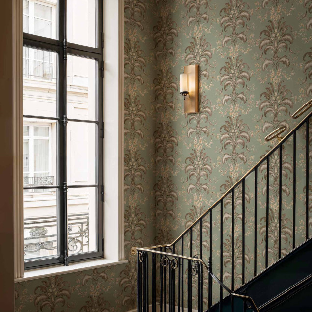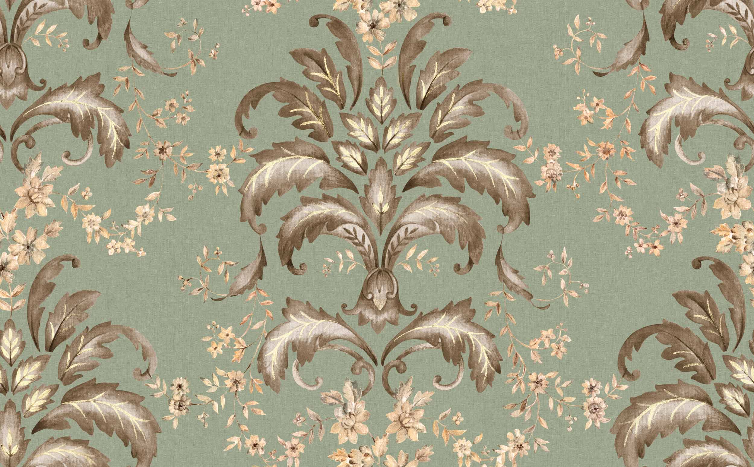Tapet cu model damasc franțuzesc pe fundal verde salvie. Ideal pentru un decor sofisticat și rafinat. Transformă-ți casa într-un spațiu plin de farmec!- Colecție: Damaskus