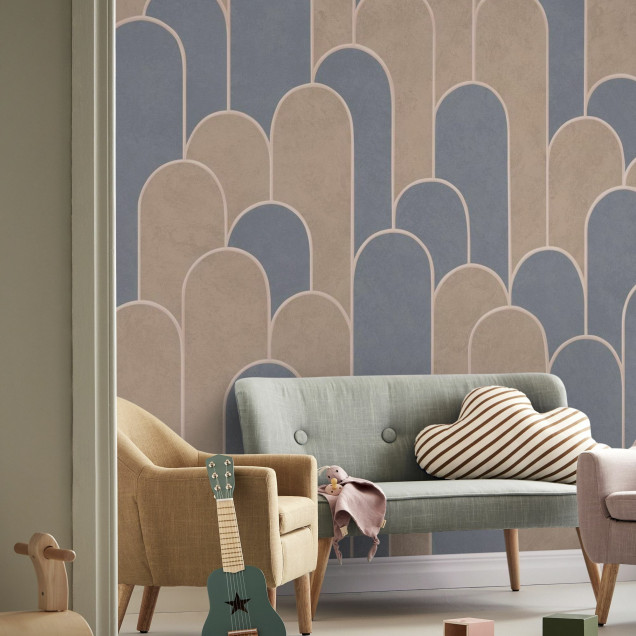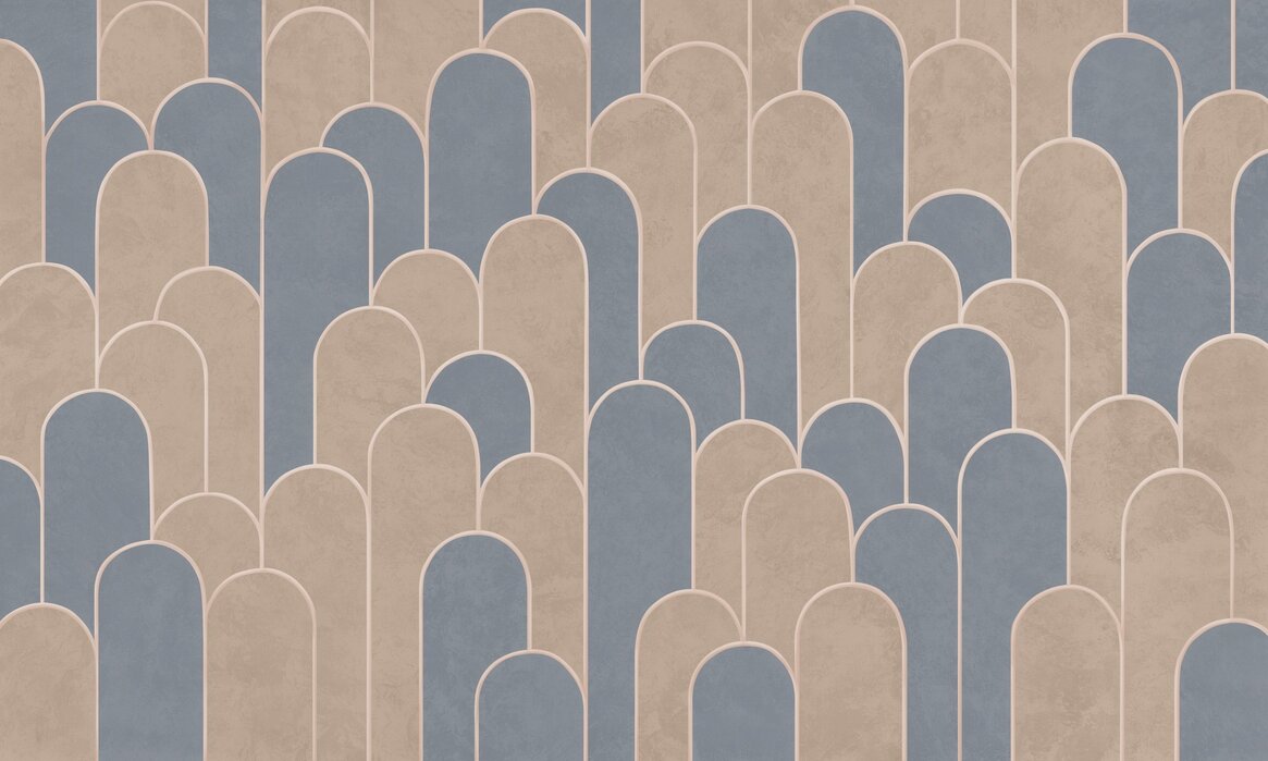Creează un spațiu unic cu acest fototapet! Model cu arcuri elegante în nuanțe de bej și albastru, perfect pentru un decor sofisticat și modern. Transformă orice cameră într-un ambient plăcut și relaxant.
