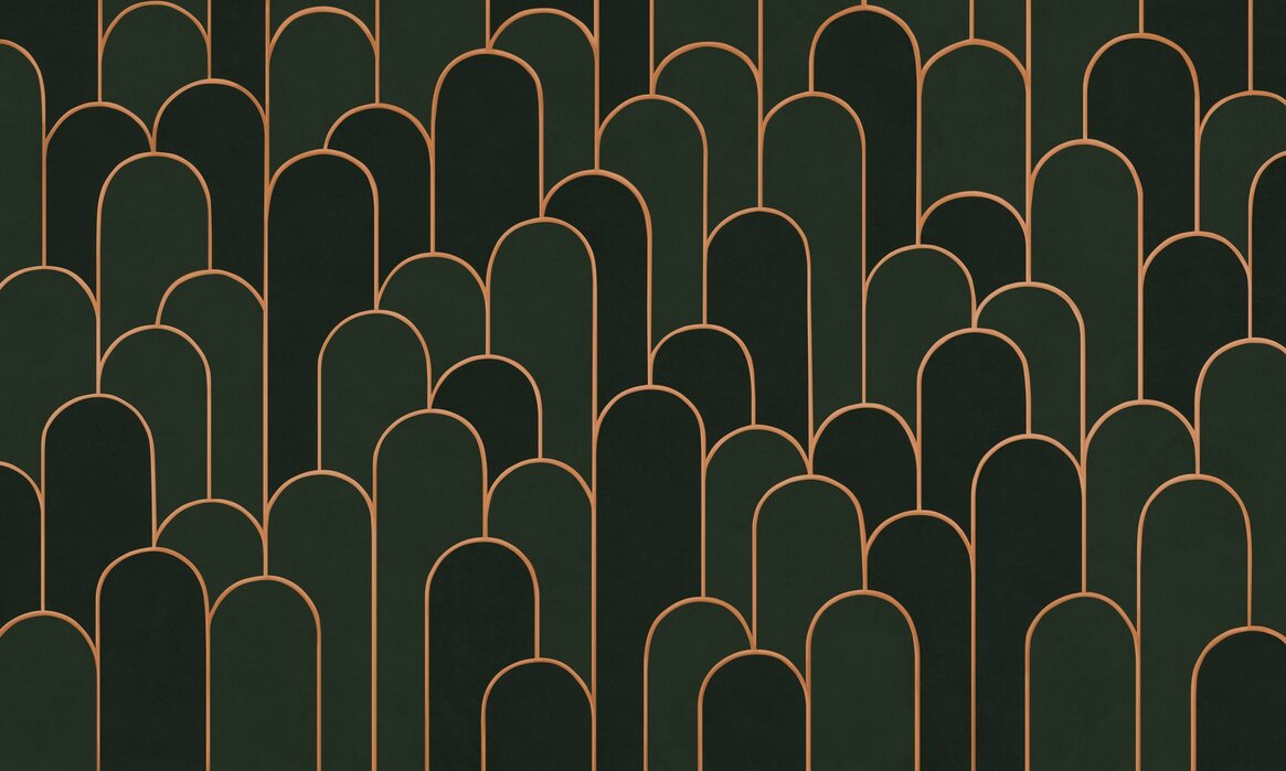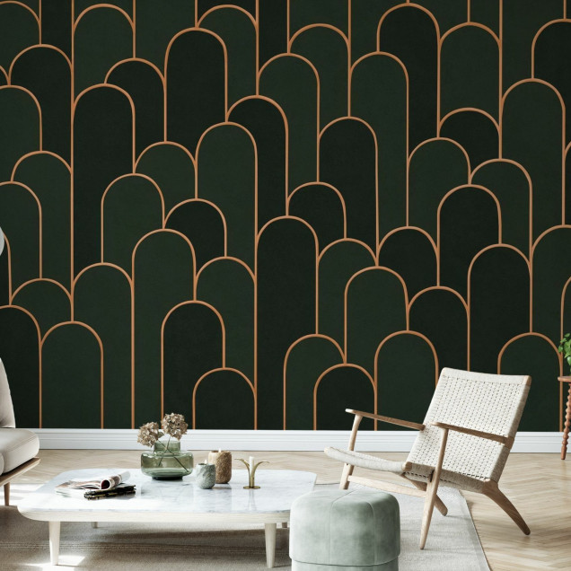 Acest fototapet aduce un plus de eleganță și rafinament oricărui spațiu. Modelul cu arce verzi și detalii aurii creează un efect vizual captivant. Ideal pentru livinguri sau dormitoare.Materiale disponibile
