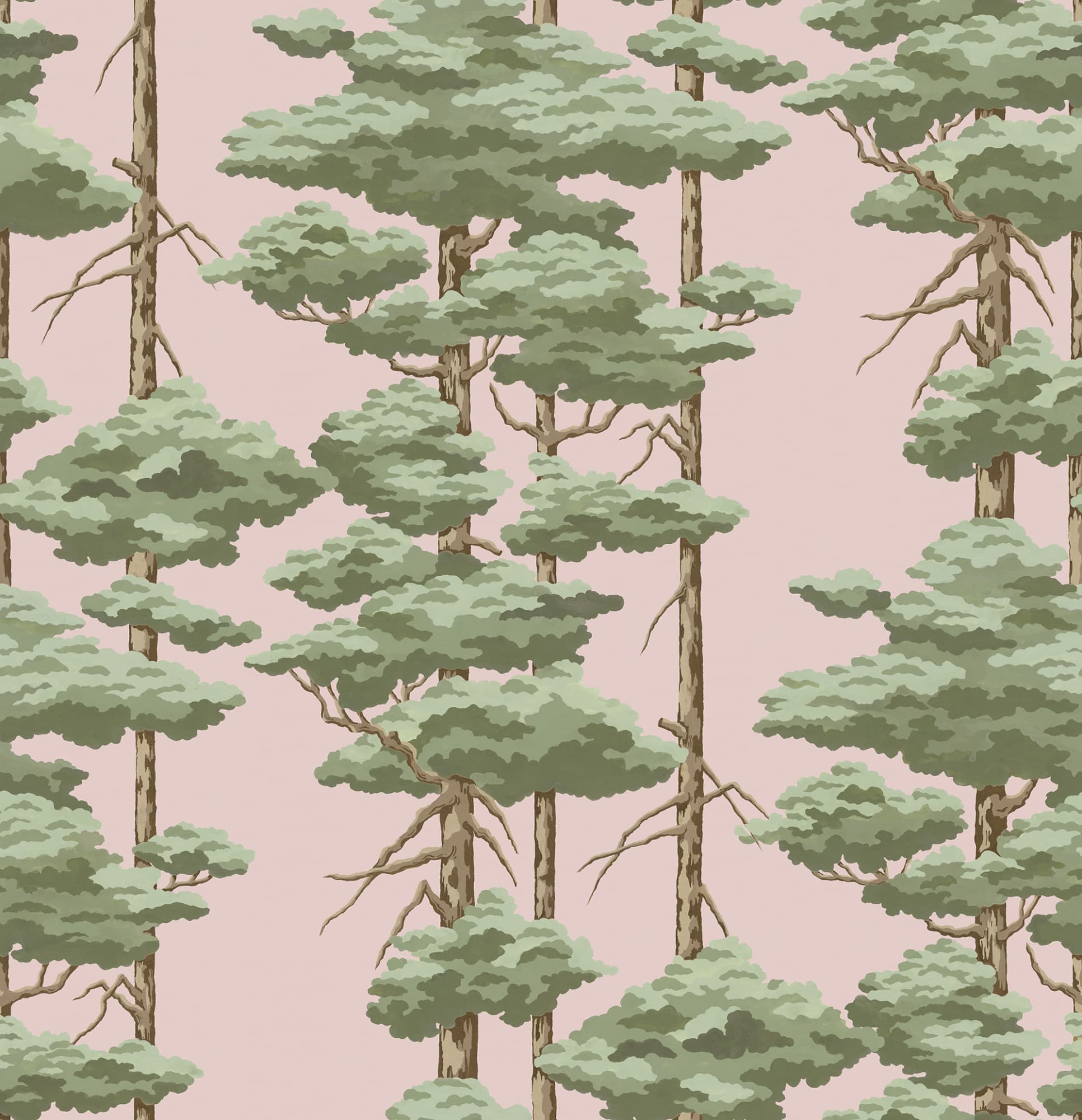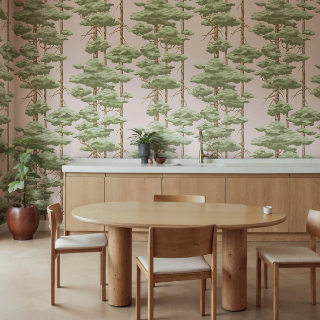 Acest tapet încântător aduce farmecul pădurilor direct în casa ta. Designul subtil cu pini verzi pe fundal roz oferă o atmosferă caldă și relaxantă.Materiale disponibile