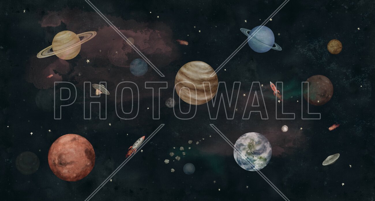 Transformă camera copilului într-o aventură cosmică cu acest fototapet! Planete, stele și rachete pentru un decor captivant.