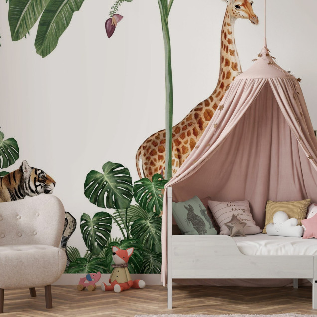 Transformă camera copilului într-o aventură exotică! Acest fototapet cu tematică junglei aduce un strop de natură și un aer jucăuș. Ideal pentru a stimula imaginația și creativitatea micuților.
