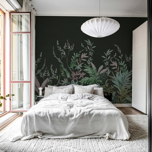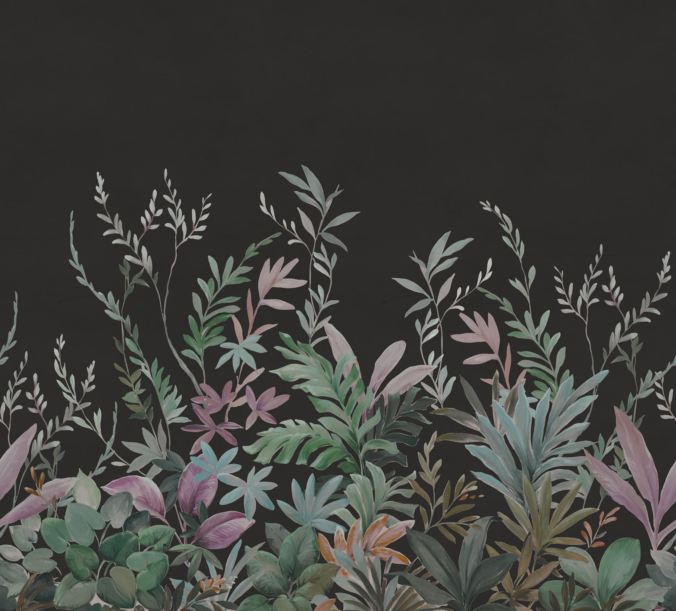 Jungle Meadow, Black, Rebel Walls Fototapet cu Motive Vegetale pe Fundal Negru