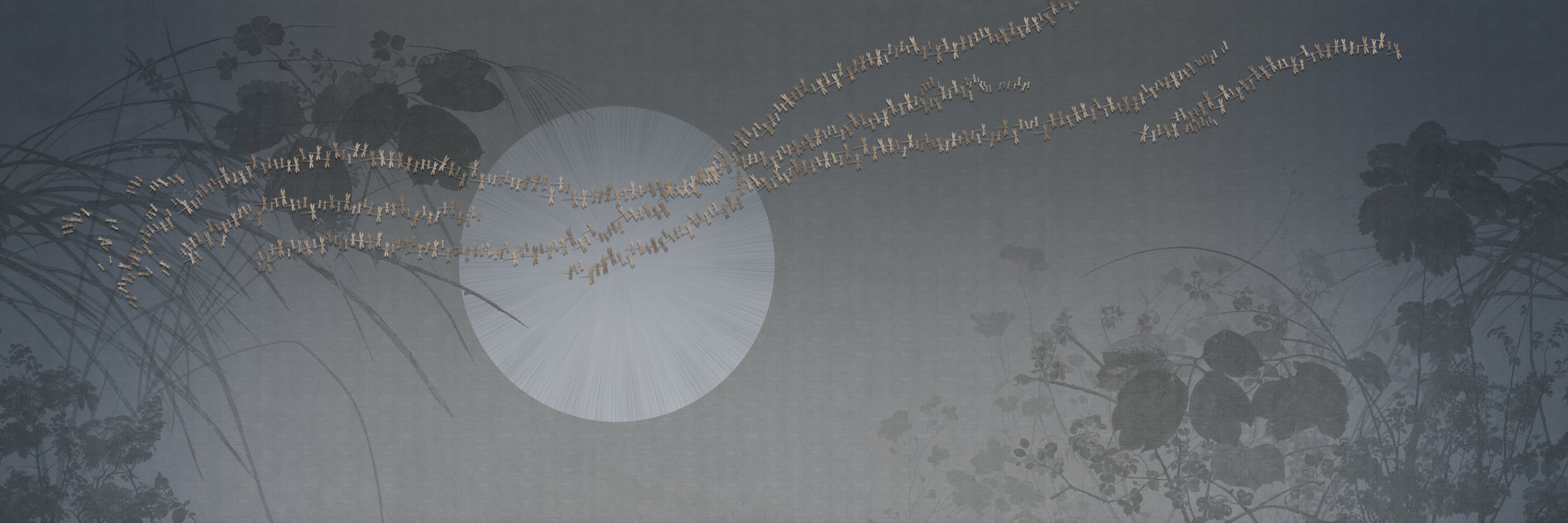 Printre siluete botanice și ierburi înalte, un mare disc astral împrăștie o lumină oblică. Mici libelule dansează, atingând marginea discului ca niște scântei de lumină. Texturile se suprapun în valuri delicate: o auroră interioară care deschide peisajul și îi încetinește timpul.