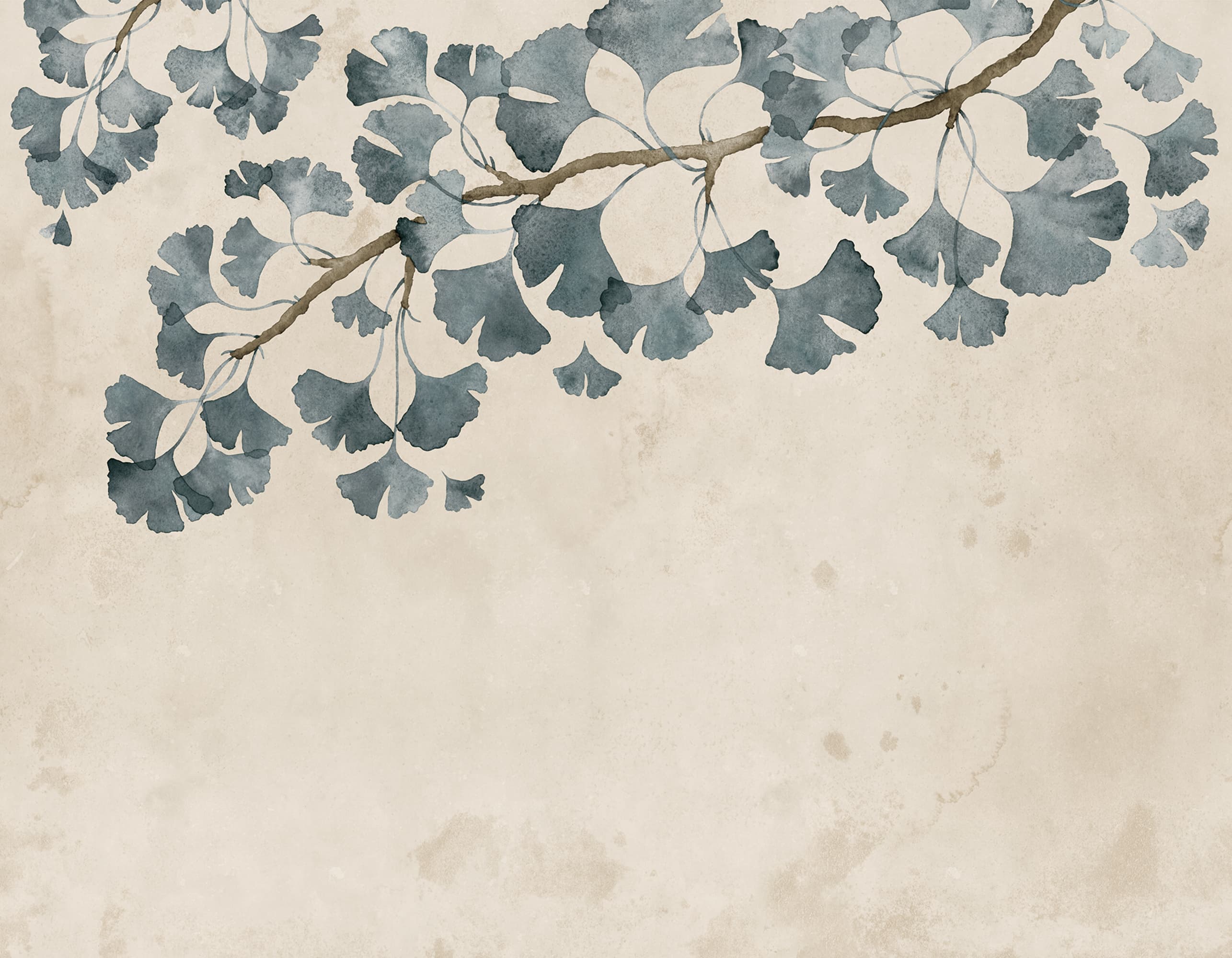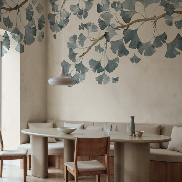 Transformă-ți casa cu acest tapet delicat, cu frunze albastre de ginkgo biloba. Perfect pentru un interior calm și sofisticat.Materiale disponibile