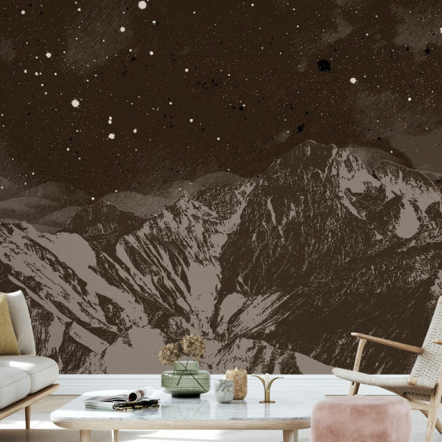 Transformă-ți casa într-un refugiu montan! Acest fototapet maro aduce frumusețea nopților înstelate și a peisajelor montane direct în livingul tău. Perfect pentru a crea o atmosferă relaxantă și contemplativă.