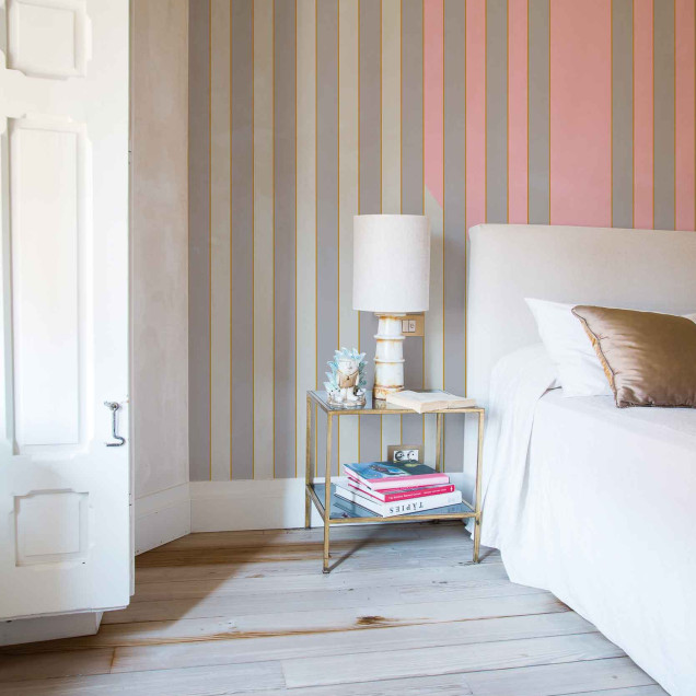 Îmbracă-ți pereții cu acest tapet elegant, cu dungi verticale în nuanțe delicate de gri și roz, accentuate subtil cu linii aurii. Perfect pentru a adăuga un plus de rafinament și căldură oricărei camere.