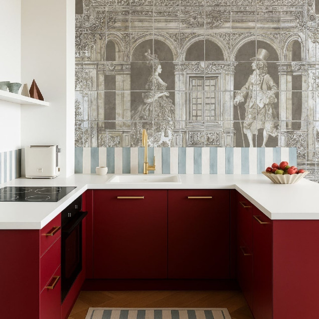 Redus în nuanțe calde de terracotta, auriu mat și accente de albastru închis, Palace Masquerade evocă interioarele luxoase ale festivităților palatice. Artistii VLAdiLA surprind tensiunea dintre eleganță și exces. Ei creează un model care transformă încăperile în scene de splendoare atemporală.