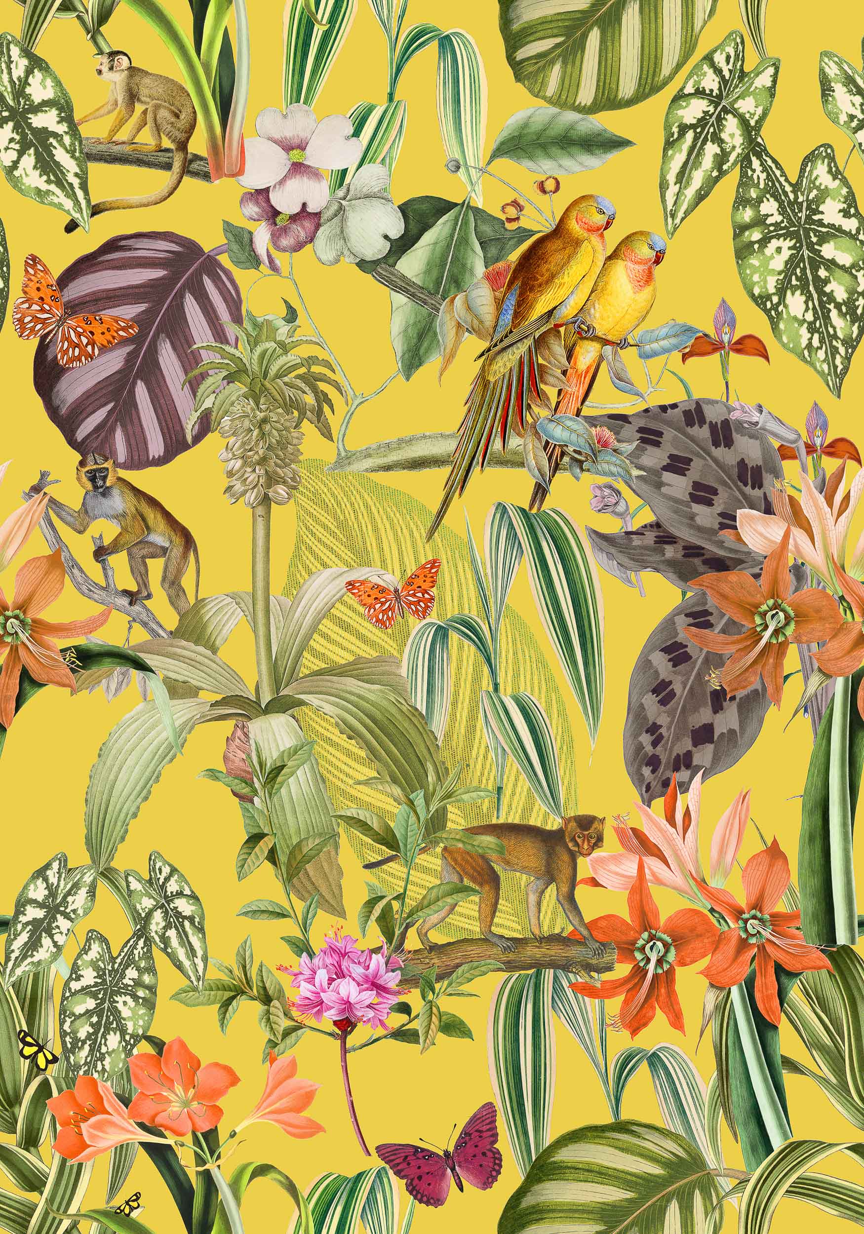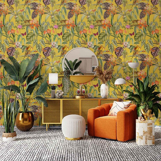 Îmbracă-ți pereții cu acest tapet vibrant, cu motive de păsări exotice și vegetație luxuriantă pe un fundal galben. Ideal pentru a aduce un strop de natură și culoare în orice încăpere. O alegere îndrăzneață pentru un decor memorabil!