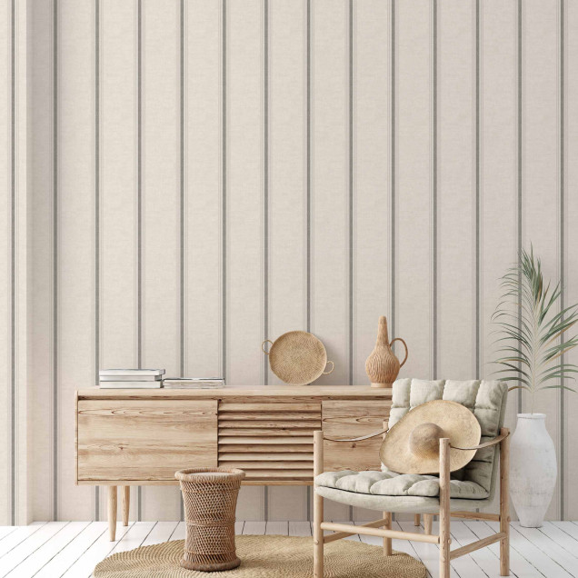 Transformă-ți casa cu acest tapet elegant cu dungi verticale gri pe fond crem. Perfect pentru un aspect sofisticat și modern. Rola acoperă 5.3mp.- Colecție: Botanika