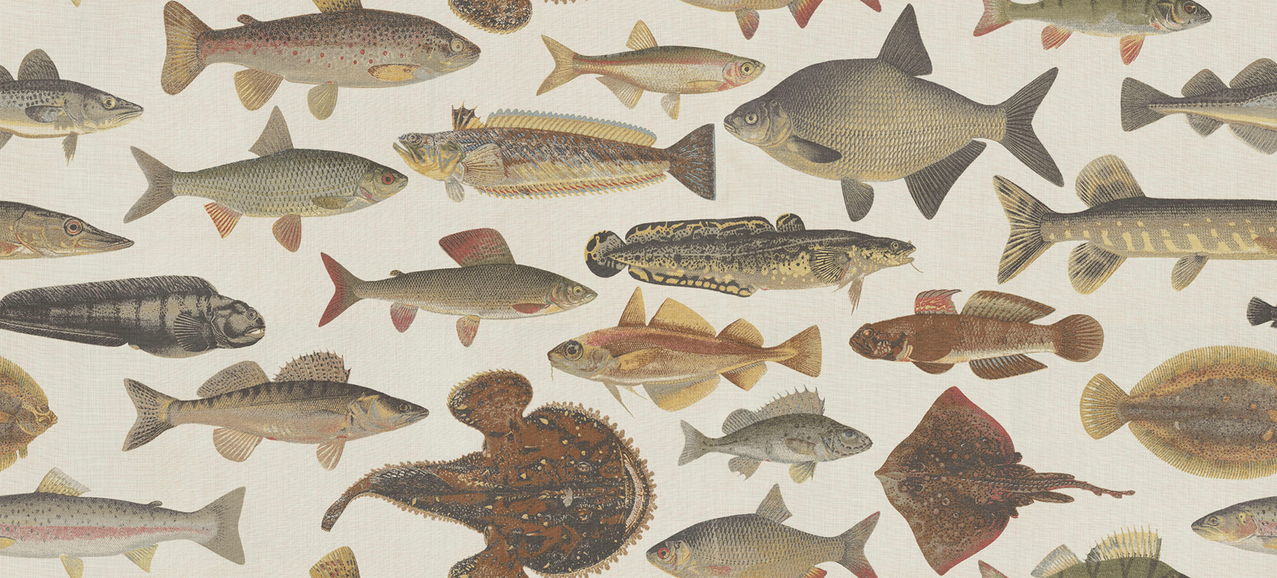 Ilustrațiile pentru acești pești provin din lucrarea "Skandinaviska fiskar" (Pește scandinav) de Wilhelm von Wright, un ilustrator finlandez activ la mijlocul secolului al XIX-lea. Motivul a fost imprimat pe o calitate frumoasă a inului și a fost cea mai avansată imprimare pe țesături realizată în Suedia în anii 1990. Motivul este acum reînviat ca murale pe perete. Fundalul bej oferă o eleganță senină care amintește de estetica Europei de Sud.