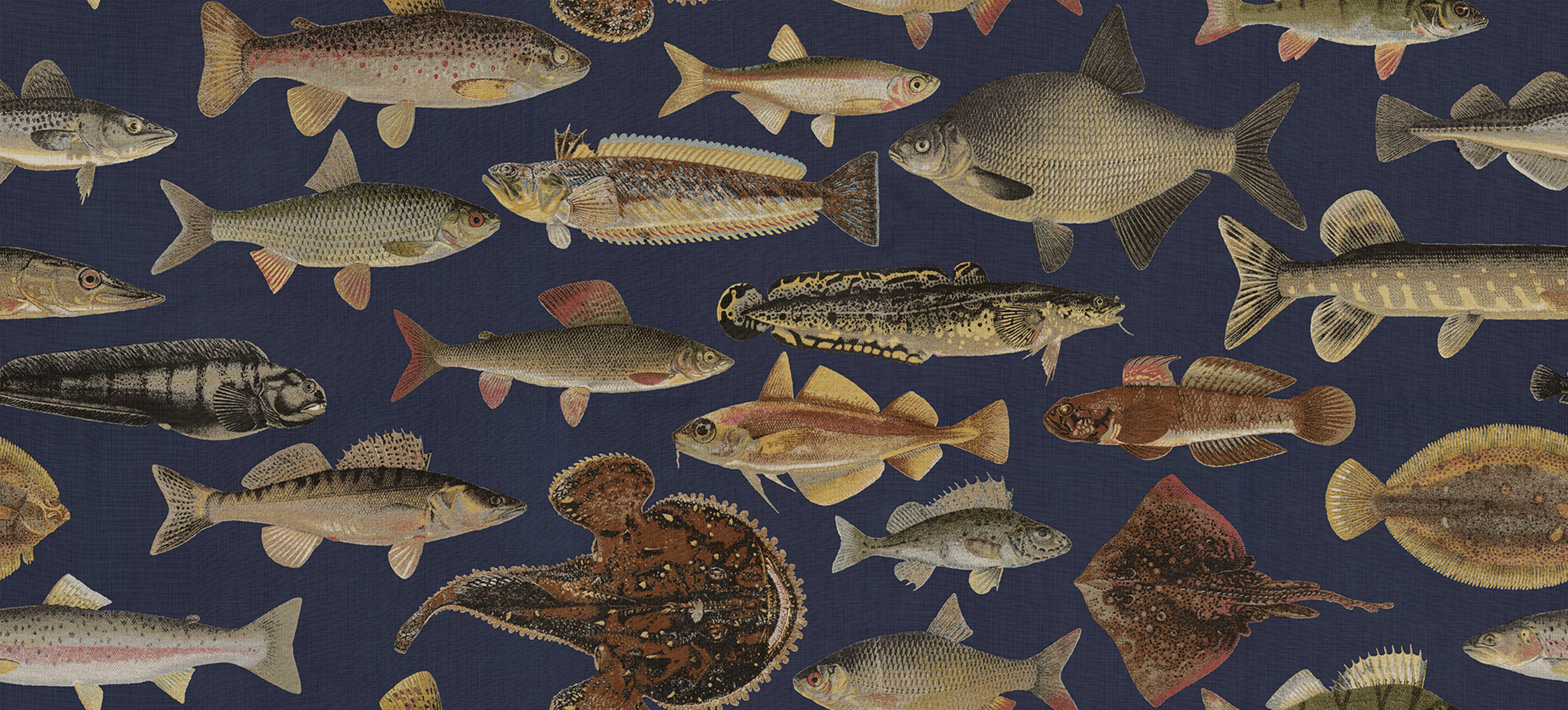 Ilustrațiile pentru acești pești provin din lucrarea "Skandinaviska fiskar" (Pește scandinav) a lui Wilhelm von Wright, un ilustrator finlandez activ la mijlocul secolului al XIX-lea. Motivul a fost imprimat pe o calitate frumoasă a inului și a fost cea mai avansată imprimare pe țesături realizată în Suedia în anii 1990. Motivul este acum reînviat ca murale pe perete, având un fundal sofisticat albastru închis.
