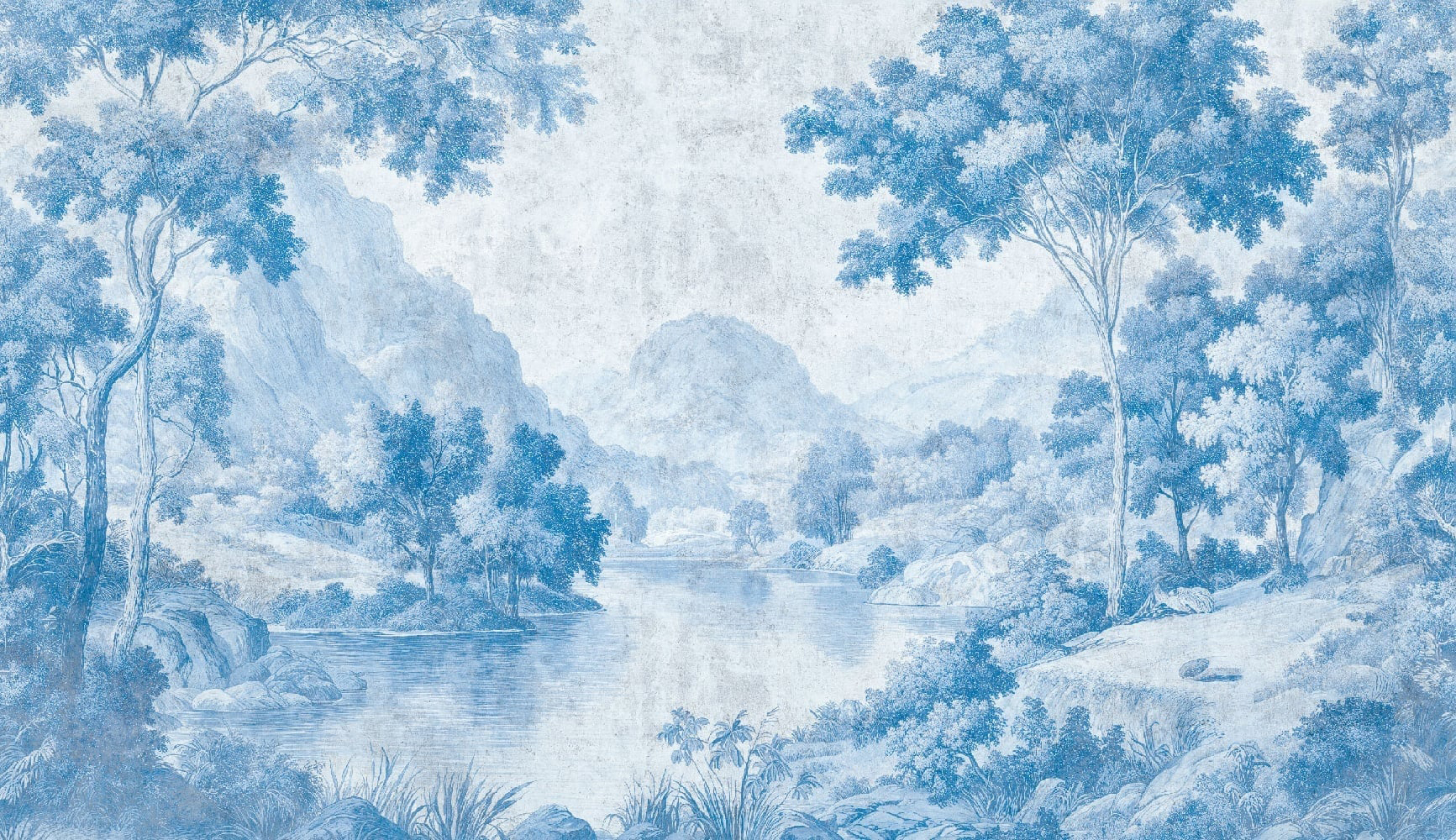 Designul se desfășoară ca o viziune panoramică — un lac înconjurat de coline, domolit de ceață și liniște. Pictat în nuanțe de albastru, turcoaz și cu accente calde de teracotă, muralul surprinde atât adâncimea, cât și luminozitatea. Calitatea artizanală se vede în texturi și în tușele suprapuse, făcând din fiecare panou o capodoperă a designului de tapet de lux.