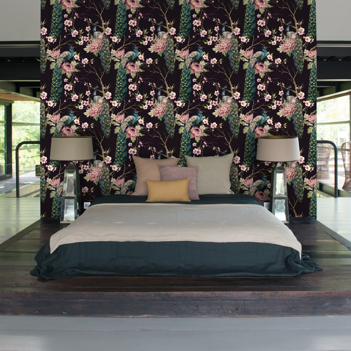 designer Midnight Gathering (Jungle Bird II) - Feathr Tapet cu pauni si flori pentru un decor elegant