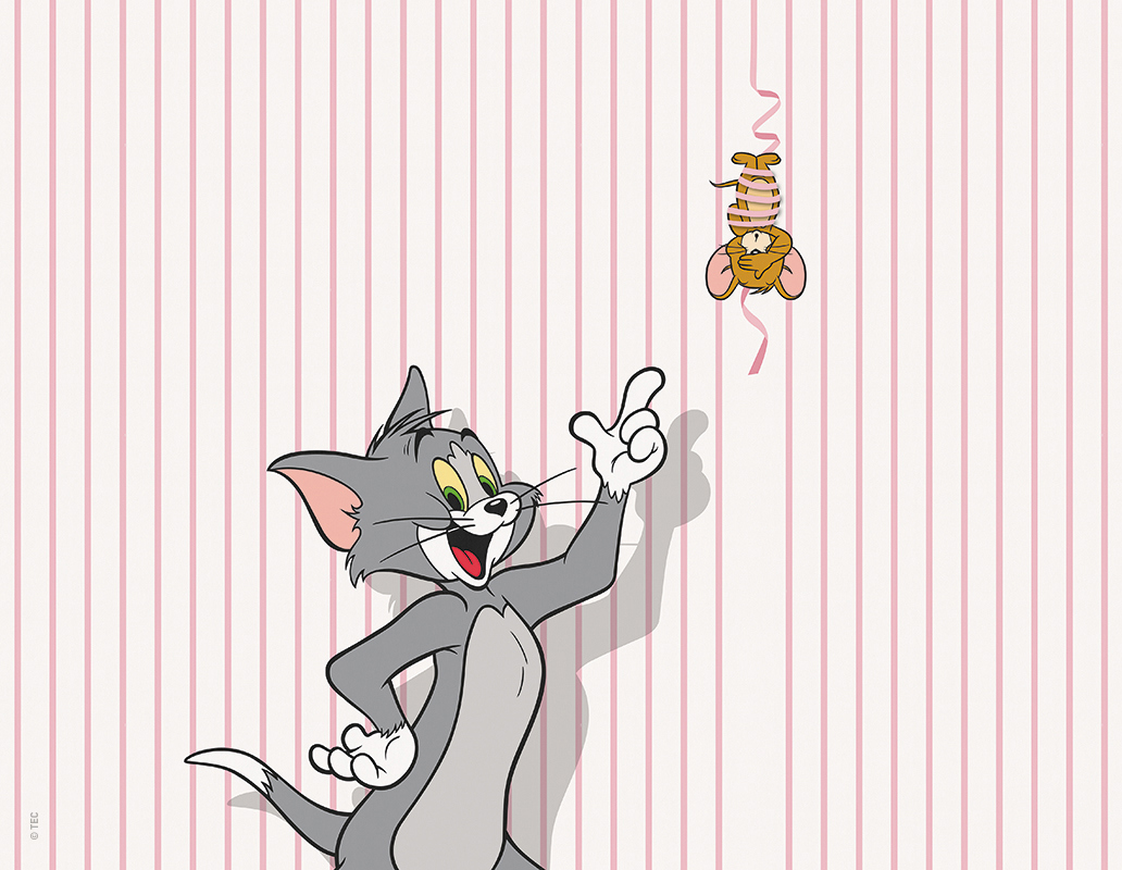 Transformă camera copilului tău într-un spațiu plin de veselie cu acest fototapet adorabil! Pisica Tom, zâmbind ștrengărește, îl indică pe șoricelul Jerry, agățat jucăuș cu o panglică roz, pe un fundal delicat cu dungi. Aduce farmecul atemporal al personajelor clasice direct pe pereți. Perfect pentru a stimula imaginația și a crea o atmosferă plină de bucurie și joc. Un decor vibrant și captivant pentru orice cameră de copii.