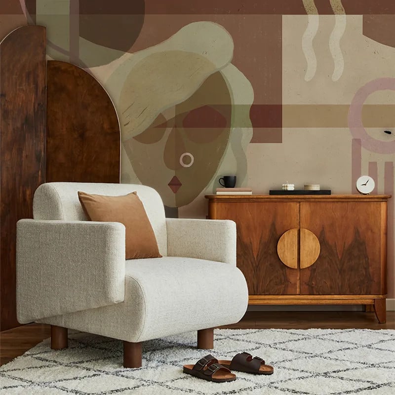 Material ce învăluie pereții într-o textură similară cu cea a inului, oferind profunzime încăperii.