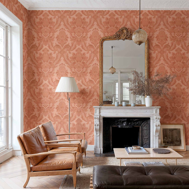 Un tapet elegant, cu un model damasc venețian în tonuri calde de piersică. Ideal pentru a adăuga un plus de rafinament și căldură oricărei încăperi. Creează un ambient primitor și sofisticat, perfect pentru livinguri sau dormitoare.
